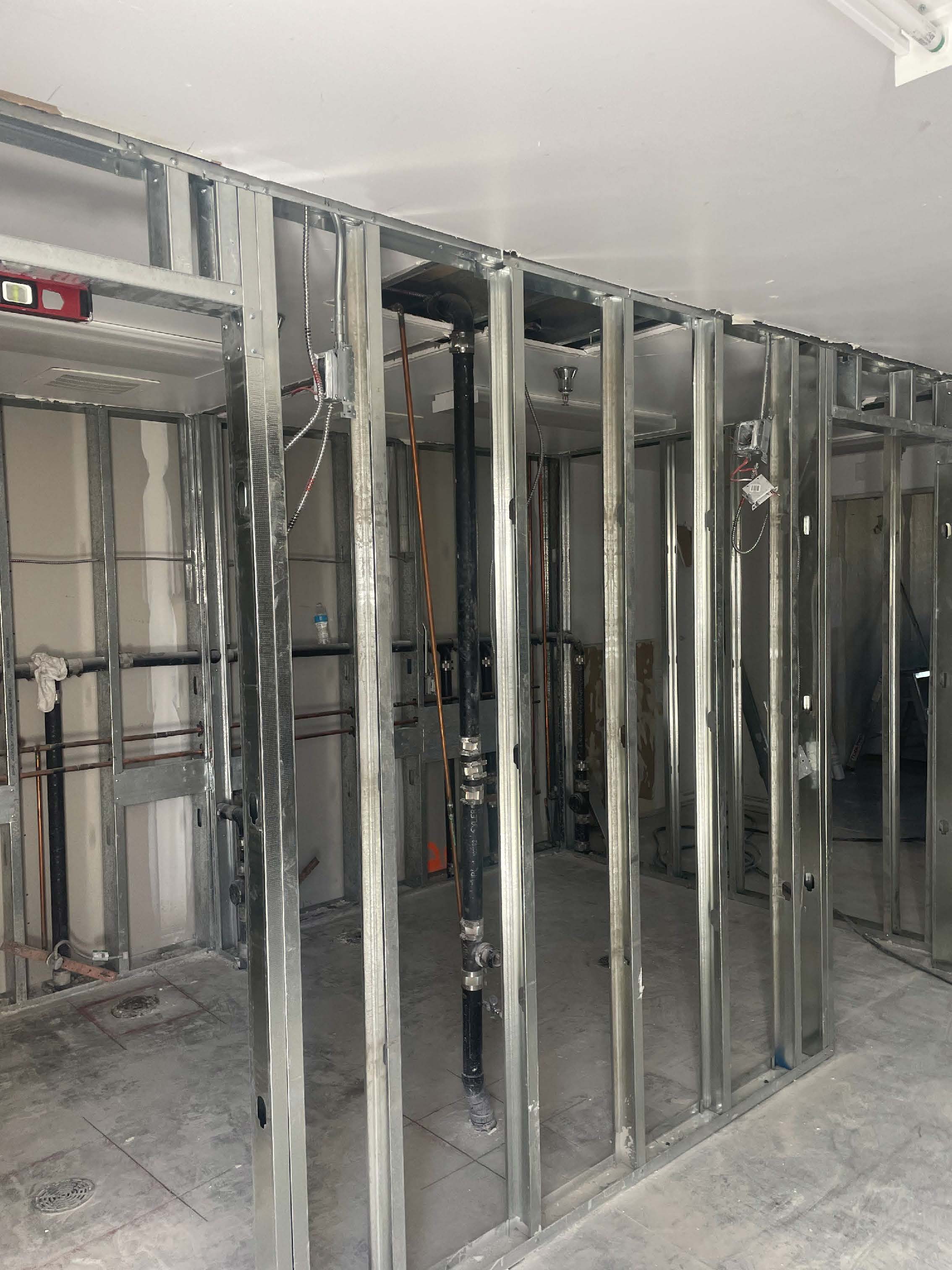 We install complete metal stud framing systems, including partition walls, soffits, fur-outs, full interior layouts, and framing for drywall installation. Whether you're building a new space or renovating an existing unit, our framing ensures accuracy, clean lines, and long-term stability. We work closely with GCs, property managers, and business owners to maintain project timelines and coordinate with other trades.